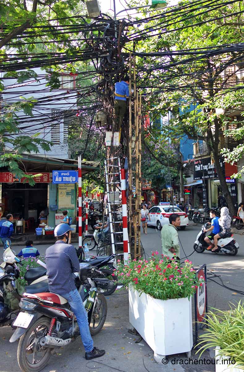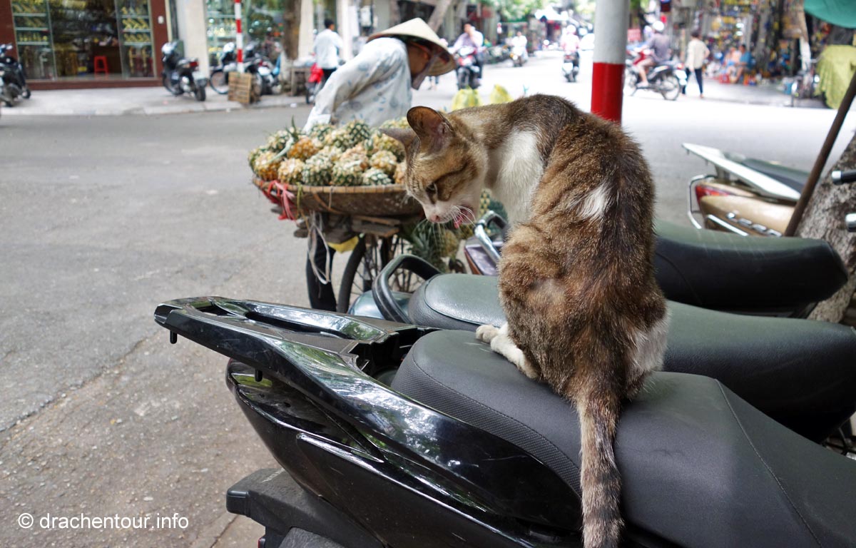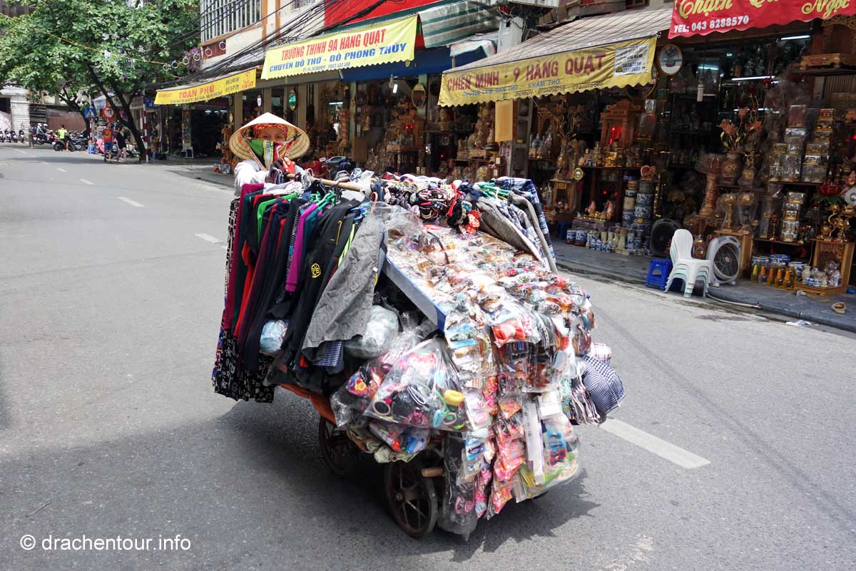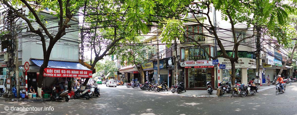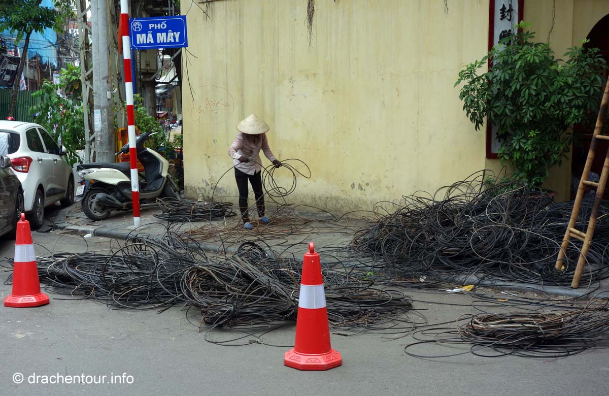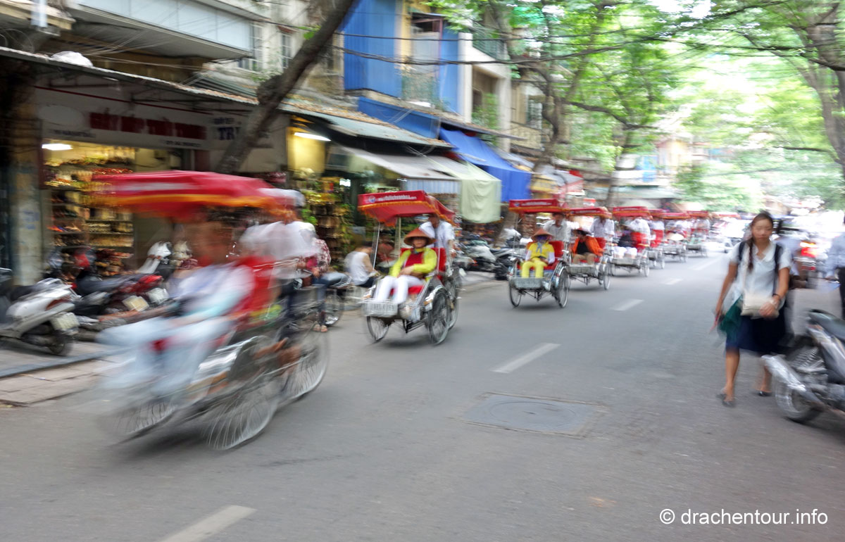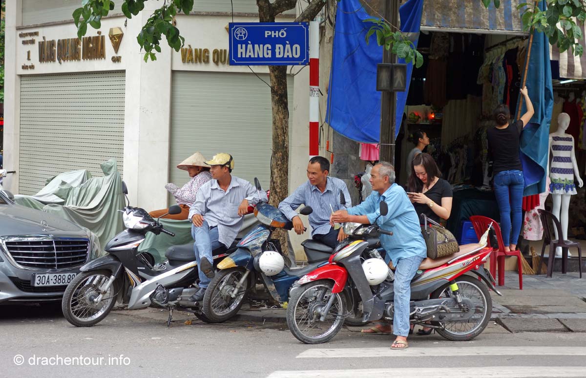 Am Nachmittag bummelten wir nochmals gemütlich durch die Altstadt und entdeckten hinter fast jeder Straßenecke wieder eine neue spannende Szene. Es kam uns so vor, als ob wir einen Dokumentation auf dem Fernsehkanal „ National Geographic “ mit dem Motto " exotische Straßenszenen in Hanoi " schauen würden - es war toll. So tauchten wir für einige Stunden wieder in das faszinierende Straßenleben der Stadt ein und beobachteten das Treiben und die Menschen. Abends zog ein Gewitter über uns und wir schafften es gerade noch halbwegs trockenen Fußes in ein Restaurant zu kommen, um wieder unsere vietnamesische Lieblingsspeise zu futtern. Der sehr heftige Regen setzte der fast unerträglichen Hitze - selbst abends um 20:00 Uhr - erstmal ein Ende und wir erfreuten uns der klaren und ganz leicht erfrischenden Luft. Beschwingt hüpften wir dann durch die vielen Wasserpfützen zu unserem Hotel zurück.
