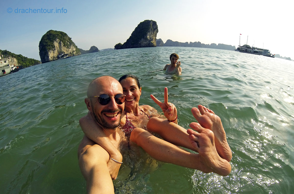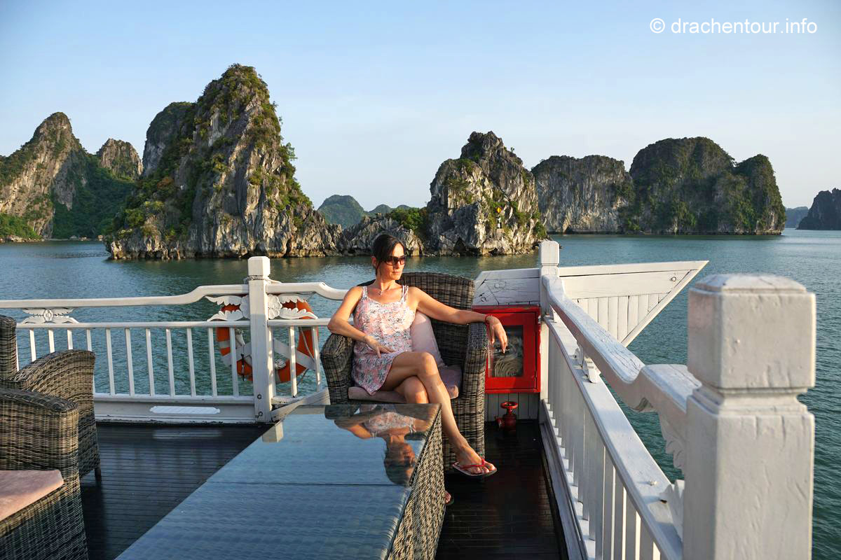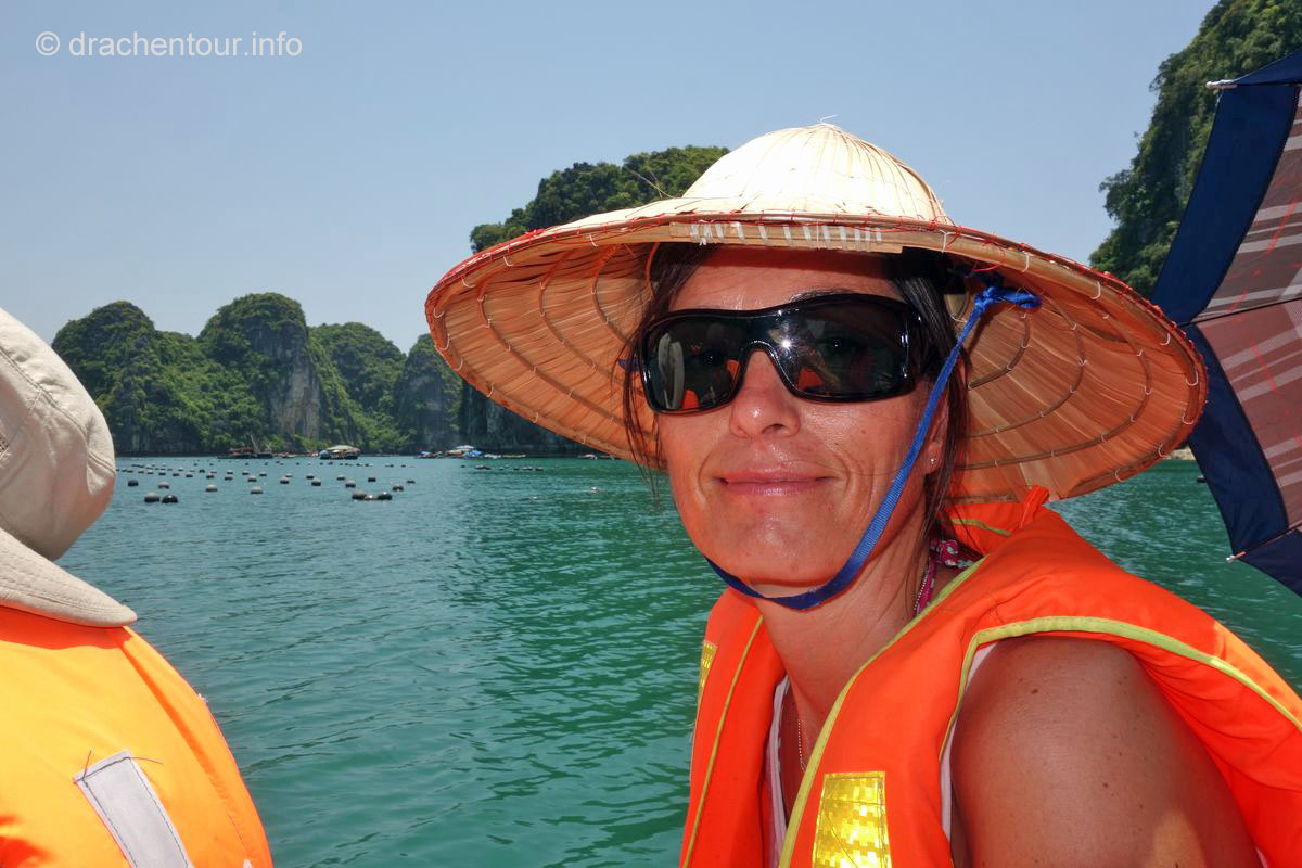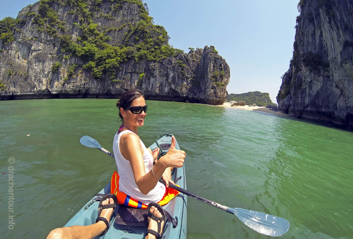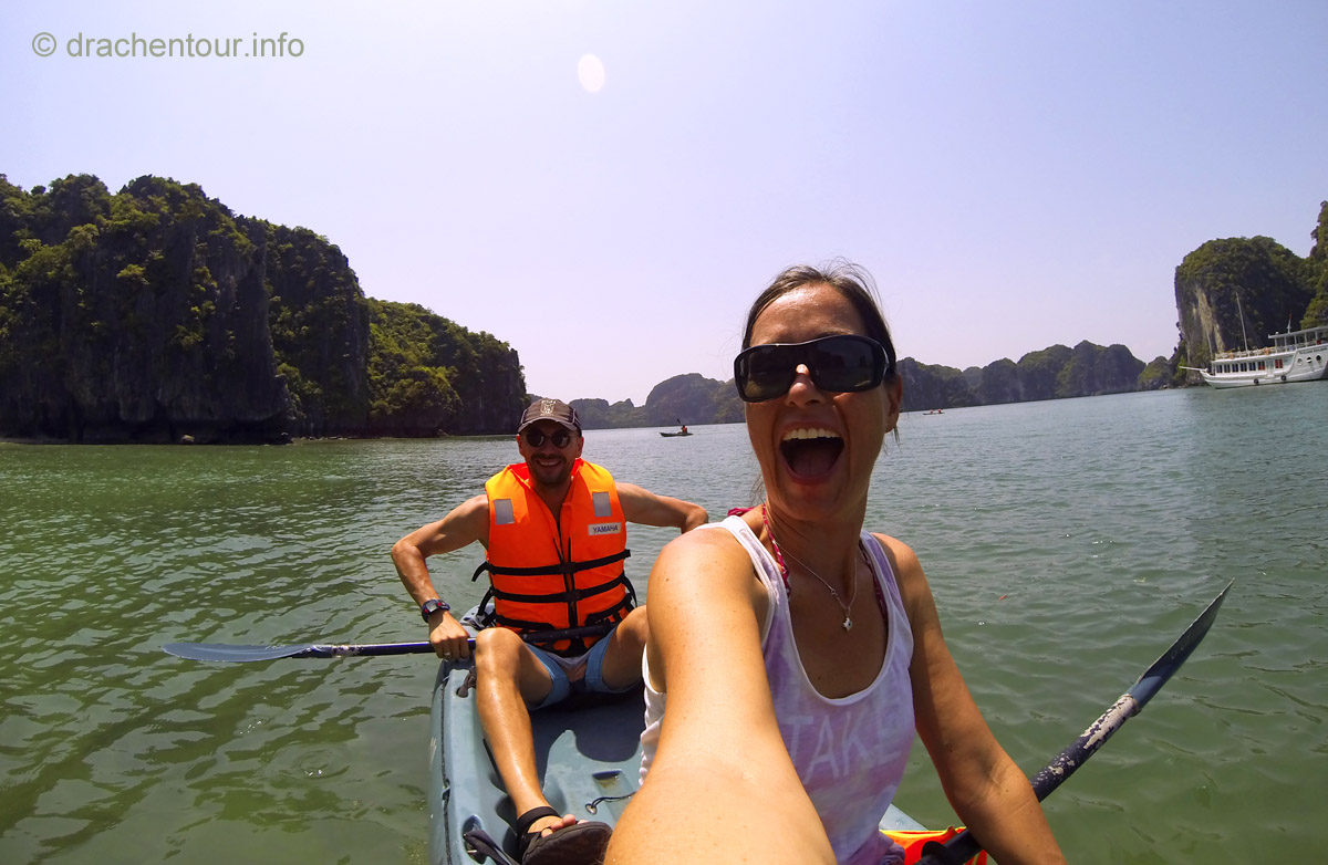 Am wunderbarsten war die Ha Long Bay selbst. Sie umfasst ein Gebiet von ungefähr 1500 km² und zeigte sich uns bei strahlend blauem Himmel von ihrer besten Seite, als wir Fahrt aufnahmen. Die fast 2000 Kalkfelsen ragen zum Teil mehrere Hundert Meter hoch bizarr aus dem Wasser. Der Anblick dieser vielen kleinen und großen Berge machte uns sprachlos und wir saßen ganz oft an Deck und bewunderten diese unfassbare Schönheit. Gemütlich schipperten wir zwei volle Tage durch diese grandiose Naturlandschaft und unternahmen ein paar Ausflüge, so besuchten wir zum Beispiel die größte Höhle der Bucht, die Sung Sot Höhle und sprangen mitten im Meer vom Boot in das grünliche Wasser oder unternahmen eine kleine Kajak-Tour zu menschenleeren Stränden. Obwohl viele, sehr viele Schiffe unterwegs waren, fanden wir uns häufig alleine auf dem Wasser, vor allem am zweiten Tag, denn die meisten Touris buchen nur eine zwei oder ein Tages-Tour, wir mit unseren drei Tagen konnten weiter aus der Bucht in Richtung Meer fahren und hatten so mehr Ruhe. Es hat uns komplett Spaß gemacht auch auf dem Boot zu übernachten und wir gewöhnten uns recht rasch an das angenehmen Schaukeln, das war ja schließlich unsere erste Kreuzfahrt.