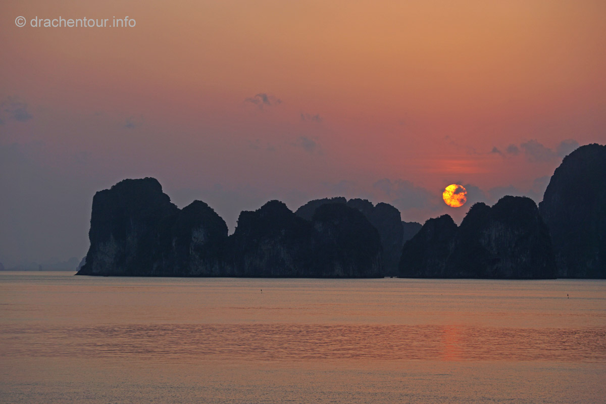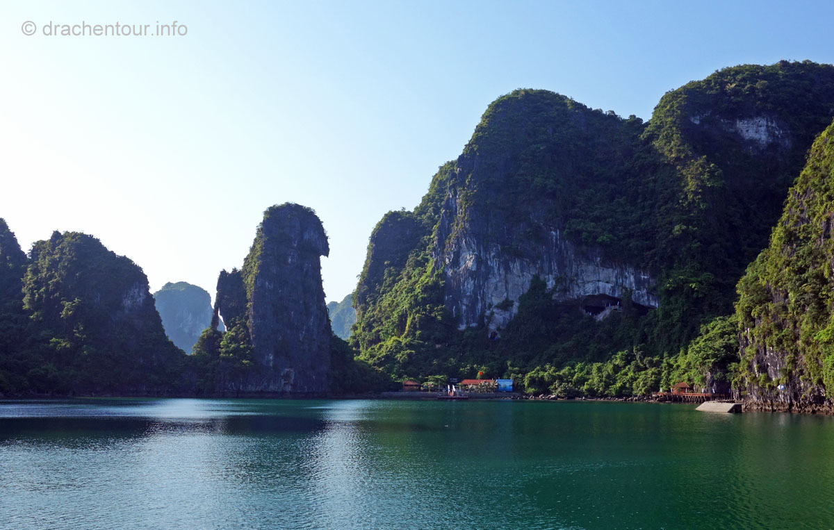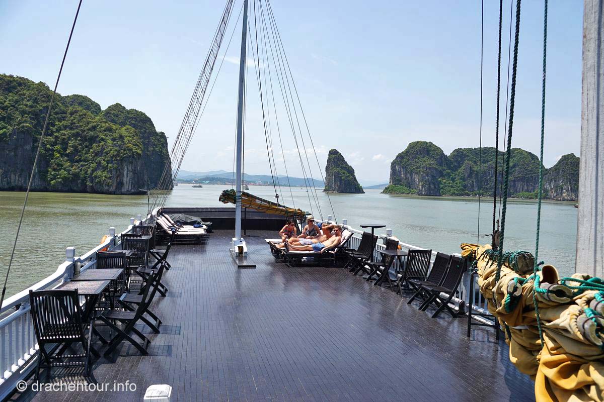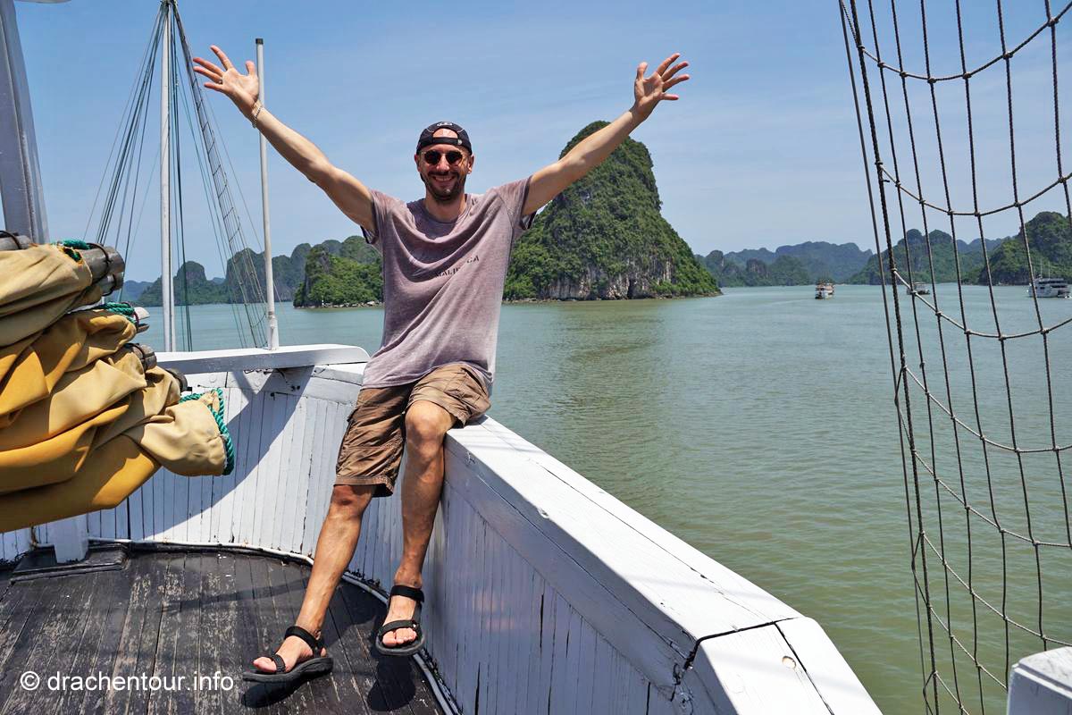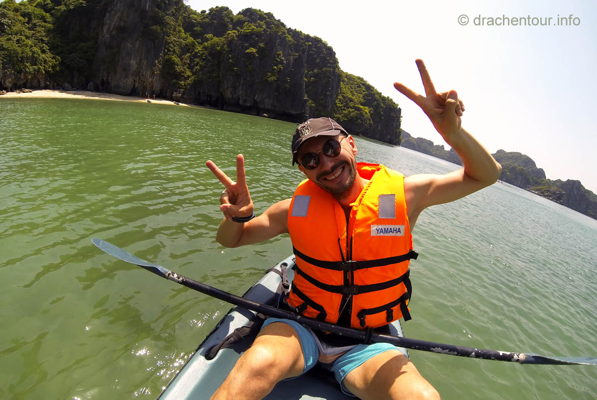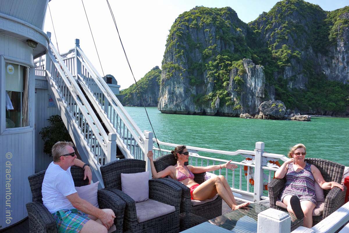 Am wunderbarsten war die Ha Long Bay selbst. Sie umfasst ein Gebiet von ungefähr 1500 km² und zeigte sich uns bei strahlend blauem Himmel von ihrer besten Seite, als wir Fahrt aufnahmen. Die fast 2000 Kalkfelsen ragen zum Teil mehrere Hundert Meter hoch bizarr aus dem Wasser. Der Anblick dieser vielen kleinen und großen Berge machte uns sprachlos und wir saßen ganz oft an Deck und bewunderten diese unfassbare Schönheit. Gemütlich schipperten wir zwei volle Tage durch diese grandiose Naturlandschaft und unternahmen ein paar Ausflüge, so besuchten wir zum Beispiel die größte Höhle der Bucht, die Sung Sot Höhle und sprangen mitten im Meer vom Boot in das grünliche Wasser oder unternahmen eine kleine Kajak-Tour zu menschenleeren Stränden. Obwohl viele, sehr viele Schiffe unterwegs waren, fanden wir uns häufig alleine auf dem Wasser, vor allem am zweiten Tag, denn die meisten Touris buchen nur eine zwei oder ein Tages-Tour, wir mit unseren drei Tagen konnten weiter aus der Bucht in Richtung Meer fahren und hatten so mehr Ruhe. Es hat uns komplett Spaß gemacht auch auf dem Boot zu übernachten und wir gewöhnten uns recht rasch an das angenehmen Schaukeln, das war ja schließlich unsere erste Kreuzfahrt.