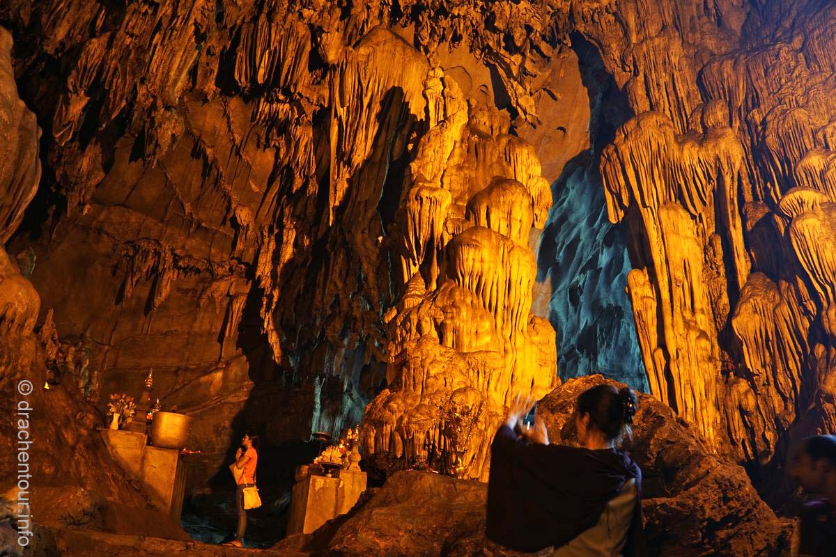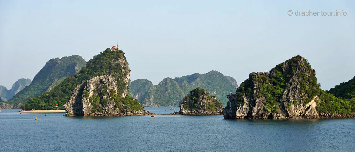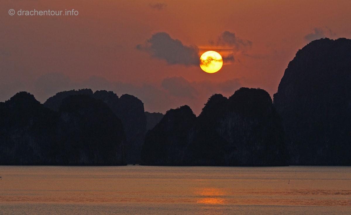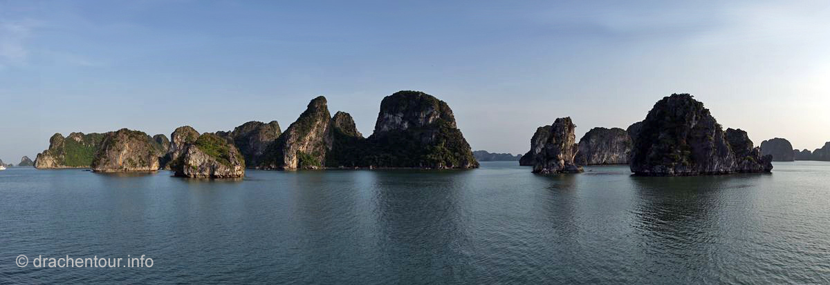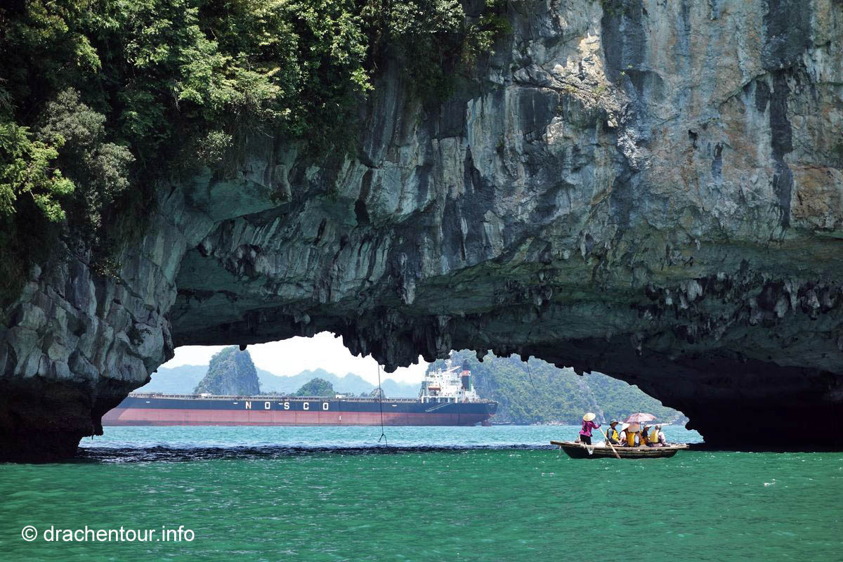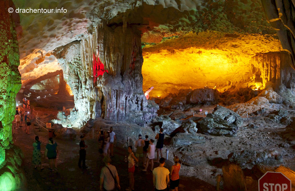 Am wunderbarsten war die Ha Long Bay selbst. Sie umfasst ein Gebiet von ungefähr 1500 km² und zeigte sich uns bei strahlend blauem Himmel von ihrer besten Seite, als wir Fahrt aufnahmen. Die fast 2000 Kalkfelsen ragen zum Teil mehrere Hundert Meter hoch bizarr aus dem Wasser. Der Anblick dieser vielen kleinen und großen Berge machte uns sprachlos und wir saßen ganz oft an Deck und bewunderten diese unfassbare Schönheit. Gemütlich schipperten wir zwei volle Tage durch diese grandiose Naturlandschaft und unternahmen ein paar Ausflüge, so besuchten wir zum Beispiel die größte Höhle der Bucht, die Sung Sot Höhle und sprangen mitten im Meer vom Boot in das grünliche Wasser oder unternahmen eine kleine Kajak-Tour zu menschenleeren Stränden. Obwohl viele, sehr viele Schiffe unterwegs waren, fanden wir uns häufig alleine auf dem Wasser, vor allem am zweiten Tag, denn die meisten Touris buchen nur eine zwei oder ein Tages-Tour, wir mit unseren drei Tagen konnten weiter aus der Bucht in Richtung Meer fahren und hatten so mehr Ruhe. Es hat uns komplett Spaß gemacht auch auf dem Boot zu übernachten und wir gewöhnten uns recht rasch an das angenehmen Schaukeln, das war ja schließlich unsere erste Kreuzfahrt.
