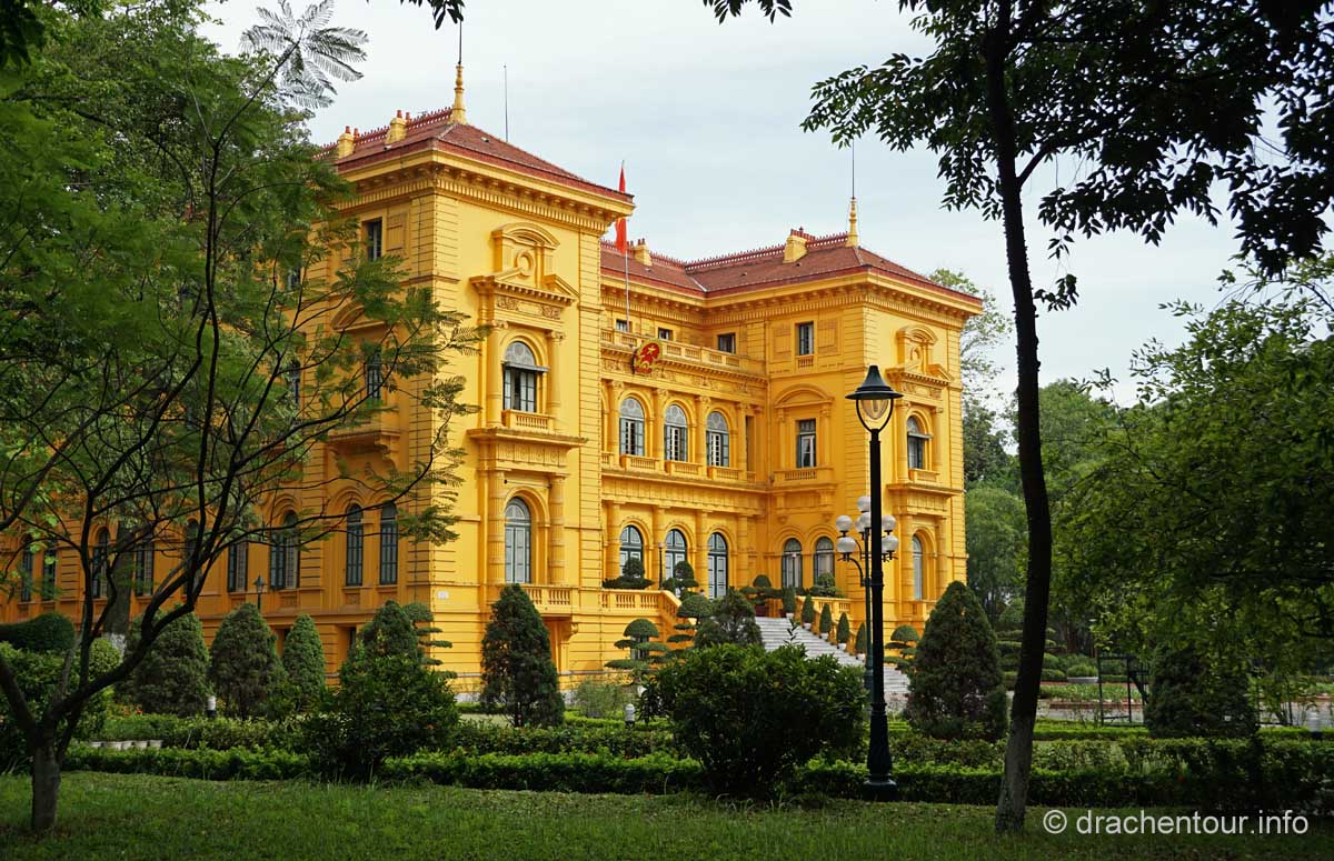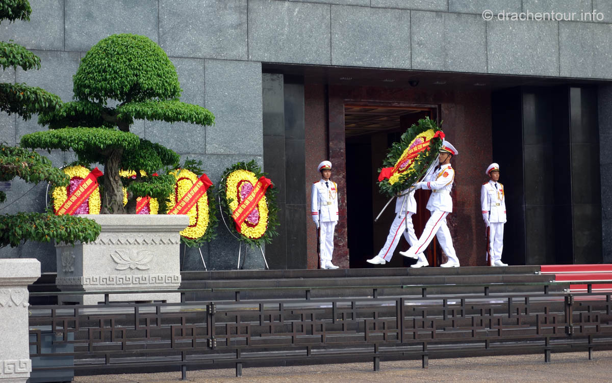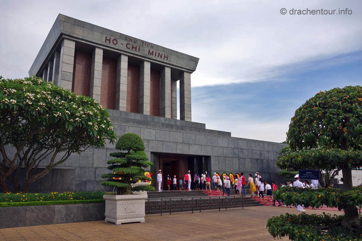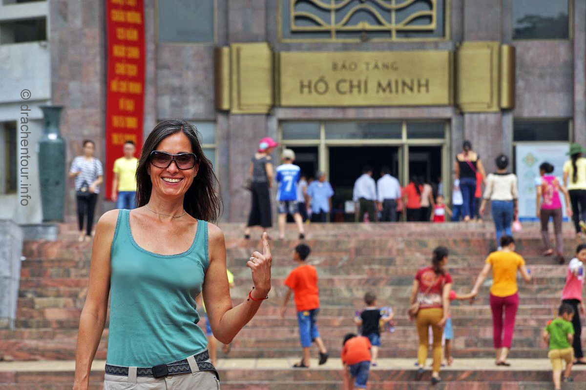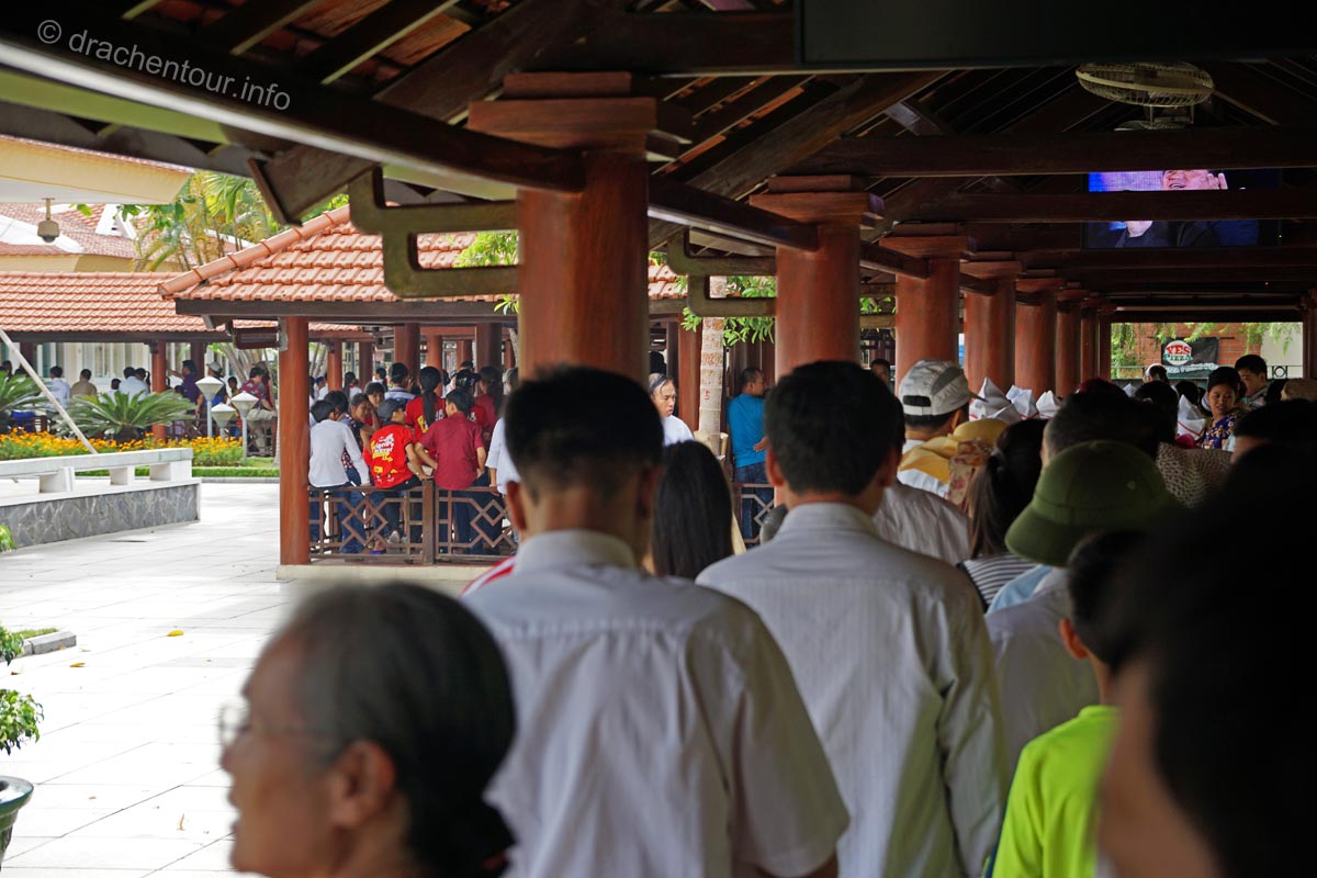 Unser letzter Tag in Hanoi begann schon sehr früh - ohne dem leckeren Frühstück - denn wir besuchten das Ho Chi Minh Mausoleum und um den langen Besucher-Schlangen zu entkommen, wollten wir die ersten sein. Um 7:30 Uhr öffnet das Mausoleum seine Pforten für die Besucher, genau zu dieser Uhrzeit waren wir auch vor Ort, aber vor uns waren Hunderte von anderen vietnamesischen Touristen. Damit haben wir nicht gerechnet, so blieb uns nichts anderes übrig als uns auf eine etwas längere Wartezeit einzustellen, aber dank China hatten wir darin ja Übung. Einige Ordner achteten akribisch darauf, dass alle ruhig und besonnen warteten, ich wurde zum Beispiel zurechtgewiesen, weil ich meine Arme vor dem Körper verschränkte ! Dann waren wir endlich im Gebäude und erblickten den Leichnam des Revolutionärs, direkt sichtbar und erstaunlich gut erhalten in einem gläsernen Sarkophag – krass !!