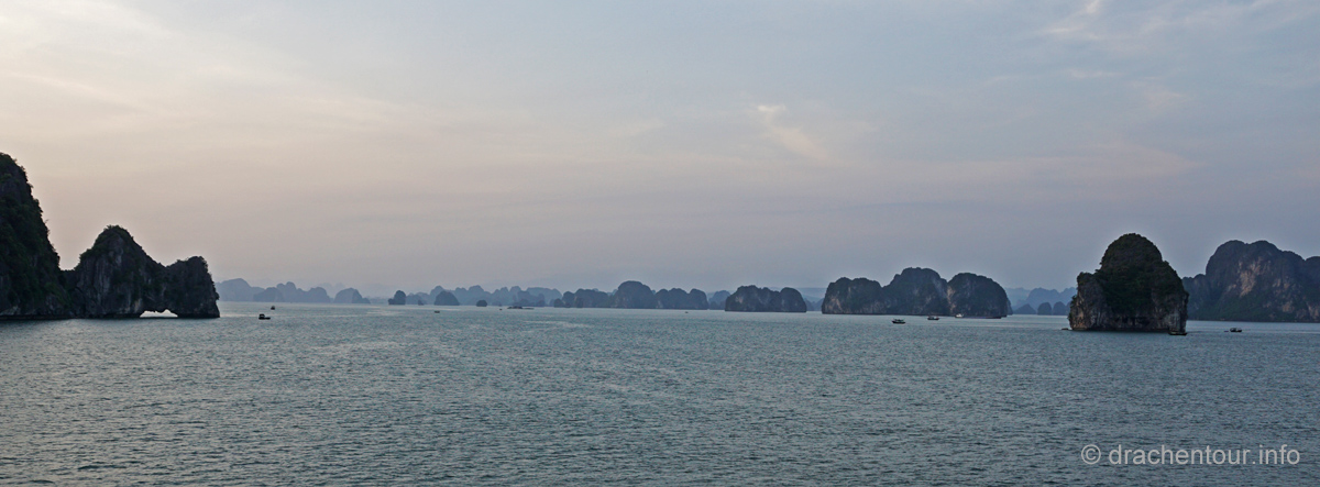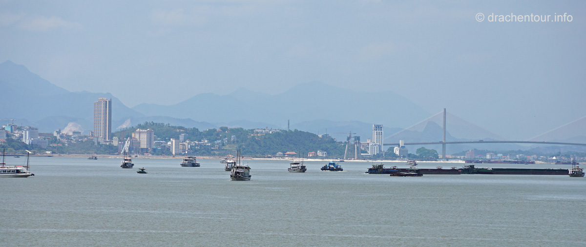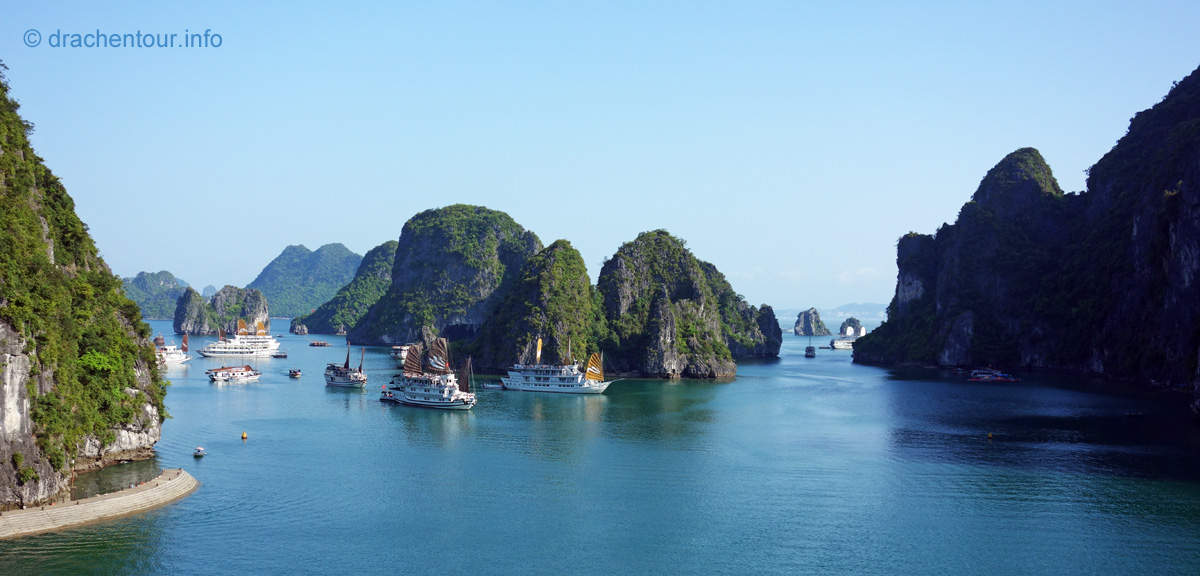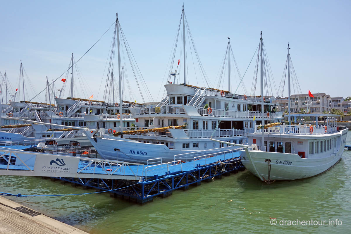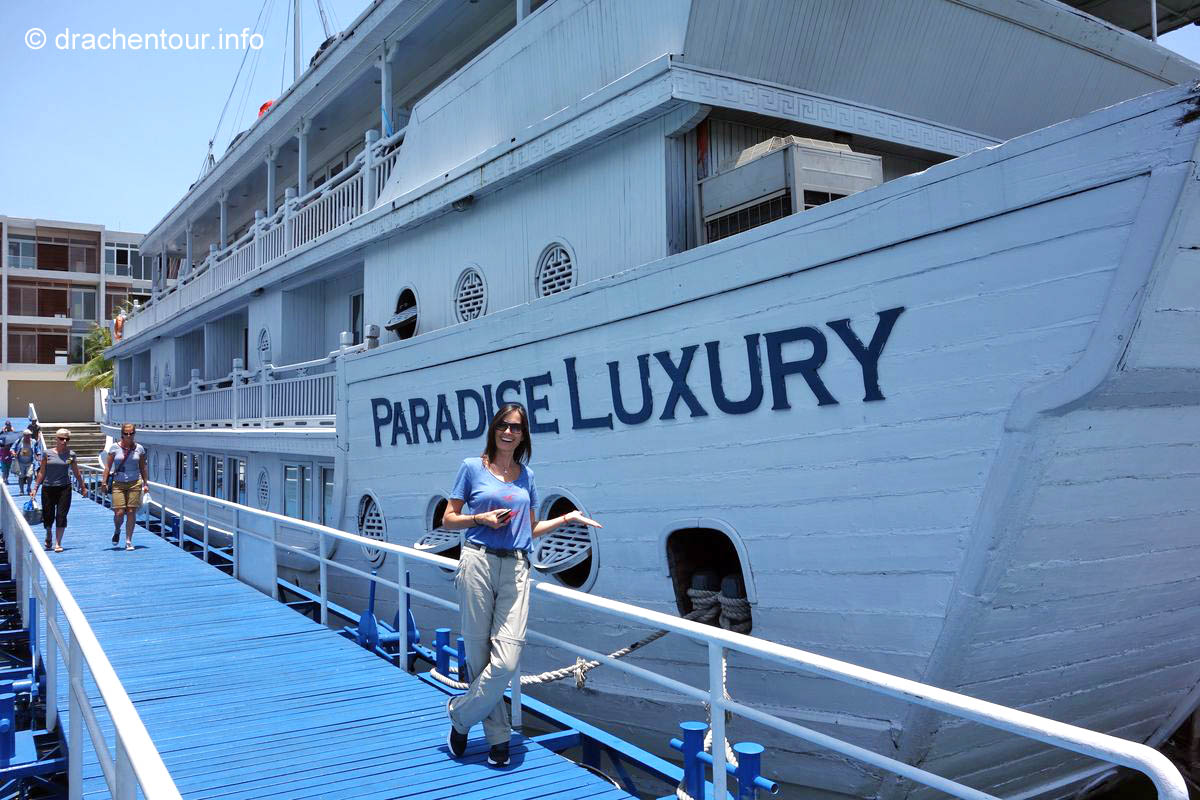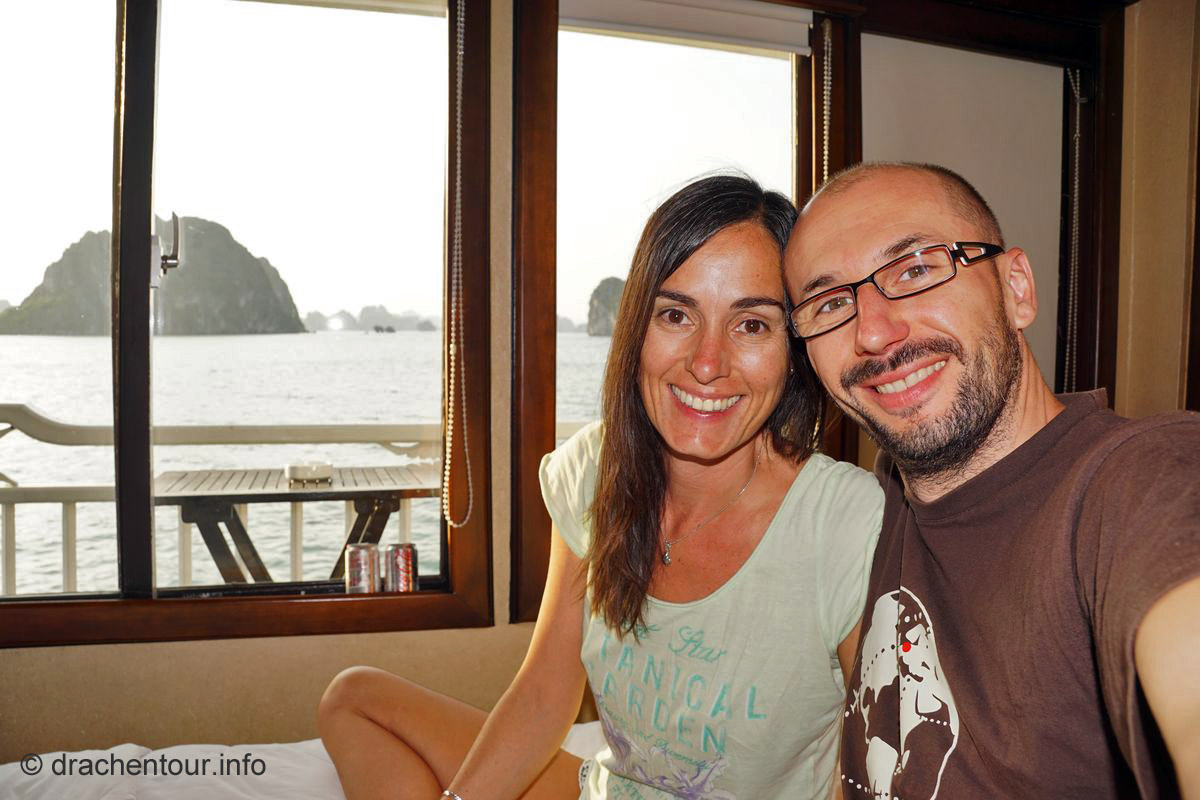 Natürlich wollten wir eines der sieben Natur-Weltwunder, welches gerade hier um die Ecke ist, nicht verpassen, deshalb stand die Ha Long Bucht ganz oben auf unserer Liste. Ursprünglich wollten wir die Tour auf eigene Faust planen, aber es kristallisierte sich ziemlich rasch heraus, dass das sehr umständlich werden würde, denn die zahlreichen Reisebüros bieten die unterschiedlichsten Pakete an, die so gut wie keine Wünsche offen ließen. So buchten wir eine dreitägige Mini-Kreuzfahrt auf dem sehr luxuriösen Boot " Paradise Luxury ", welches zu den Booten des Tourenanbieters " Paradise Cruises " gehörte. Mit dieser Buchung hatten wir das Sorglos-Paket an Land gezogen, es war zwar etwas teurer als andere Angebote, aber nach der China Reise wollten wir uns auch mal wieder verwöhnen lassen und außerdem wollten wir dieses Naturwunder in Ruhe betrachten und genießen. Wie sich in den kommenden drei Tagen herausstellen sollte, war das eine spitzenmäßige Entscheidung und wir kamen in den Genuss eines einzigartigen Erlebnisses, für das wir sehr dankbar sind. Aber nun der Reihe nach : mit einem Luxus-Minibus ( das fängt ja schon mal gut an ) wurden wir auf eine kleine Insel, namens Tuan Chau gefahren, um an Board unseres schönen alten Holzbootes zu gehen. Dort wurden wir sehr freundlich begrüßt und bezogen unsere Kajüte - total schön ! Wir hatten ein großes Doppelbett, einen kleinen Schrank und sogar ein eigenes Badezimmer mit WC und Dusche, das Beste waren allerdings die riesengroßen Panoramafenster, wir waren von allem begeistert ! Diese Begeisterung hielt in den kommenden Tagen beständig an. Alles war bestens organisiert, angefangen bei der Verpflegung bis hin zu dem Programm, die Crewmitglieder, sowie die Guides waren total nett und sehr hilfsbereit, wir haben uns rund um wohl gefühlt.