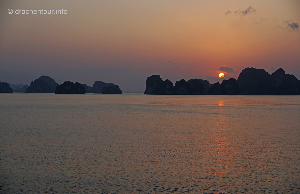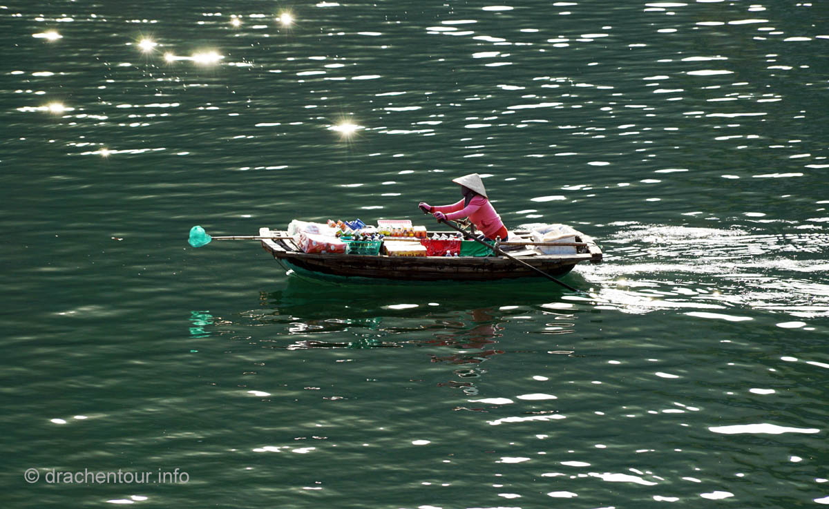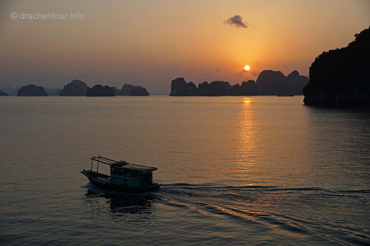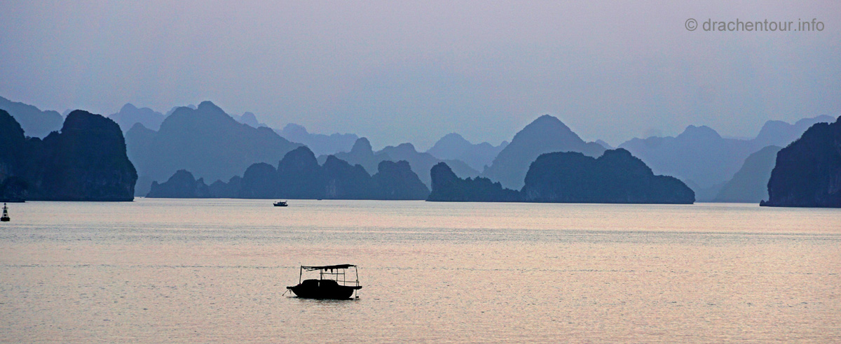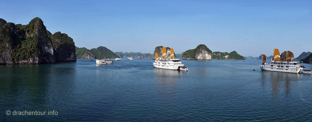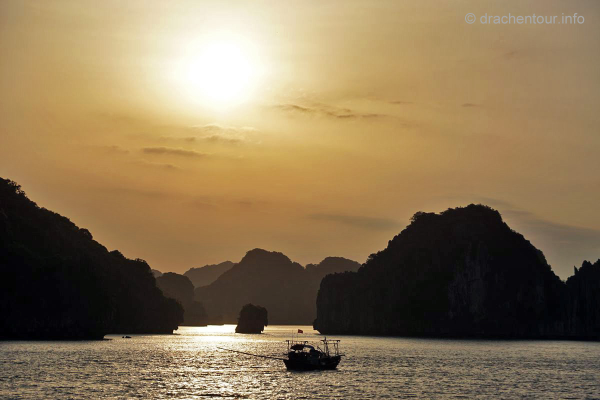 Natürlich wollten wir eines der sieben Natur-Weltwunder, welches gerade hier um die Ecke ist, nicht verpassen, deshalb stand die Ha Long Bucht ganz oben auf unserer Liste. Ursprünglich wollten wir die Tour auf eigene Faust planen, aber es kristallisierte sich ziemlich rasch heraus, dass das sehr umständlich werden würde, denn die zahlreichen Reisebüros bieten die unterschiedlichsten Pakete an, die so gut wie keine Wünsche offen ließen. So buchten wir eine dreitägige Mini-Kreuzfahrt auf dem sehr luxuriösen Boot " Paradise Luxury ", welches zu den Booten des Tourenanbieters " Paradise Cruises " gehörte. Mit dieser Buchung hatten wir das Sorglos-Paket an Land gezogen, es war zwar etwas teurer als andere Angebote, aber nach der China Reise wollten wir uns auch mal wieder verwöhnen lassen und außerdem wollten wir dieses Naturwunder in Ruhe betrachten und genießen. Wie sich in den kommenden drei Tagen herausstellen sollte, war das eine spitzenmäßige Entscheidung und wir kamen in den Genuss eines einzigartigen Erlebnisses, für das wir sehr dankbar sind. Aber nun der Reihe nach : mit einem Luxus-Minibus ( das fängt ja schon mal gut an ) wurden wir auf eine kleine Insel, namens Tuan Chau gefahren, um an Board unseres schönen alten Holzbootes zu gehen. Dort wurden wir sehr freundlich begrüßt und bezogen unsere Kajüte - total schön ! Wir hatten ein großes Doppelbett, einen kleinen Schrank und sogar ein eigenes Badezimmer mit WC und Dusche, das Beste waren allerdings die riesengroßen Panoramafenster, wir waren von allem begeistert ! Diese Begeisterung hielt in den kommenden Tagen beständig an. Alles war bestens organisiert, angefangen bei der Verpflegung bis hin zu dem Programm, die Crewmitglieder, sowie die Guides waren total nett und sehr hilfsbereit, wir haben uns rund um wohl gefühlt.