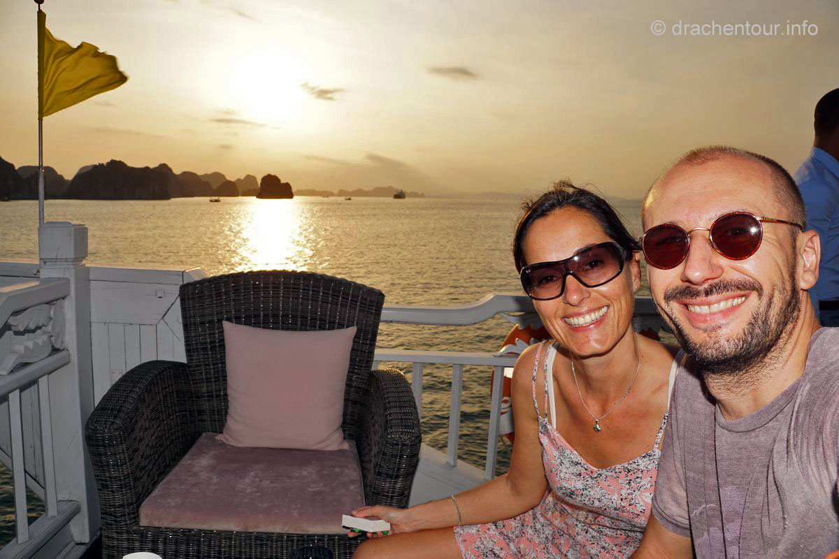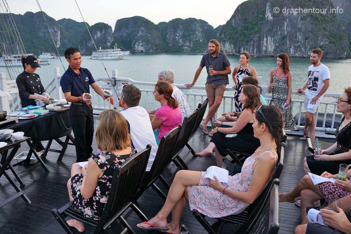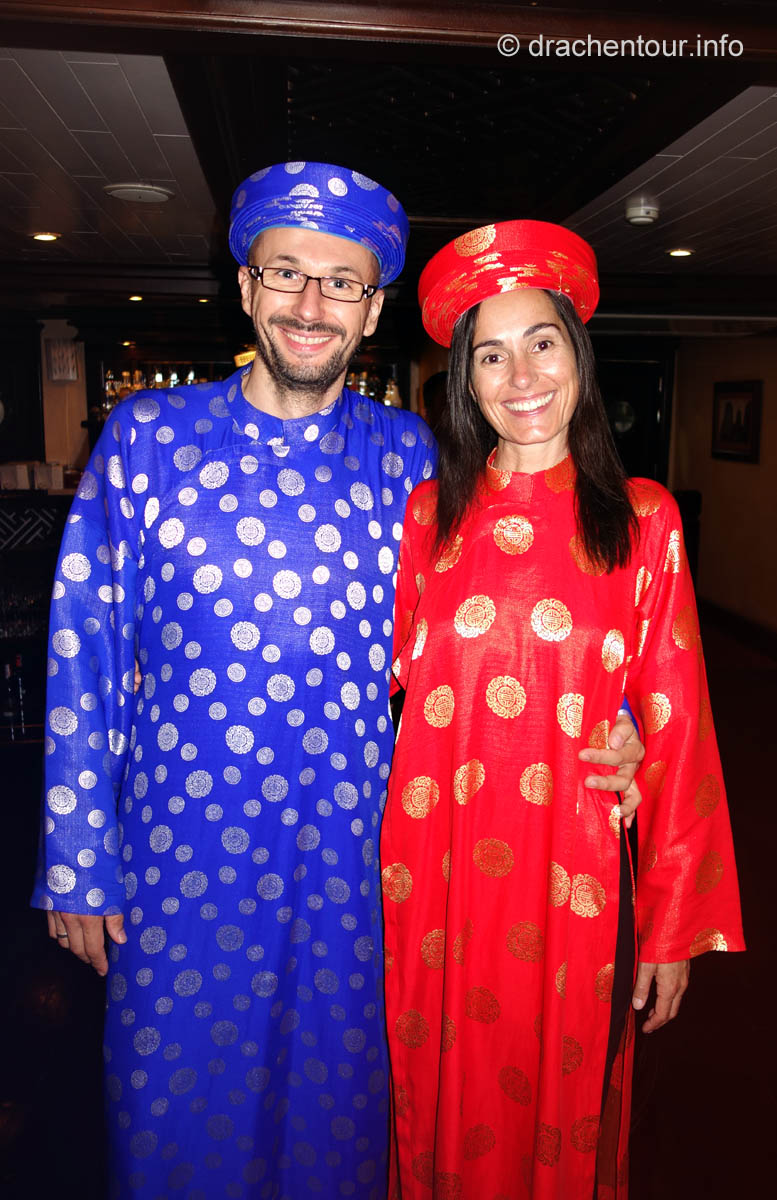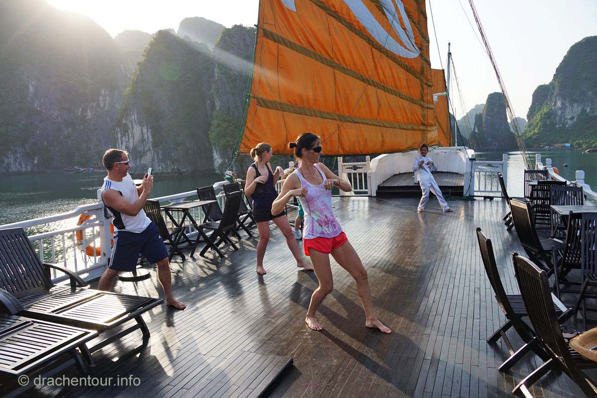 Auch das von den Crewmitgliedern veranstaltete Programm war angenehm, so nahmen wir morgens auf dem Deck beim Tai-Chi Kurs teil, Marek erhielt eine Auszeichnung als perfekter Spring-Rolls-Koch und auch das typisch vietnamesische Dinner, zu dem wir die traditionellen Gewänder anziehen durften, war ein angenehmes Spektakel.
