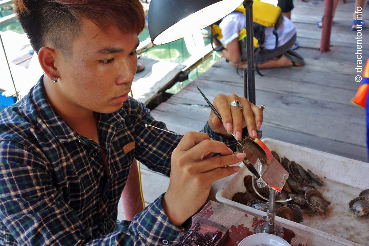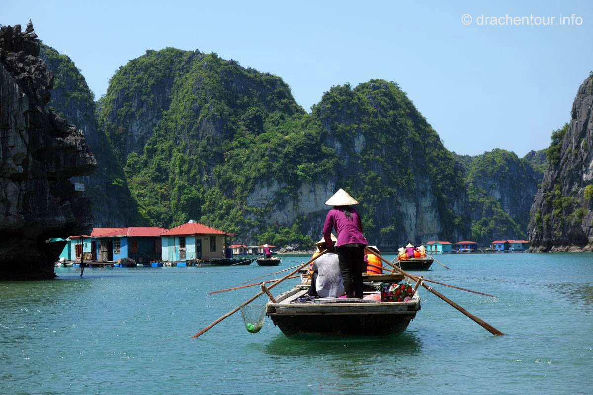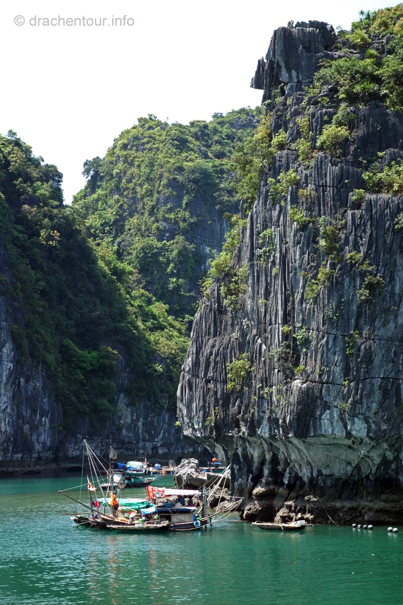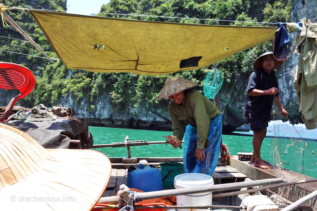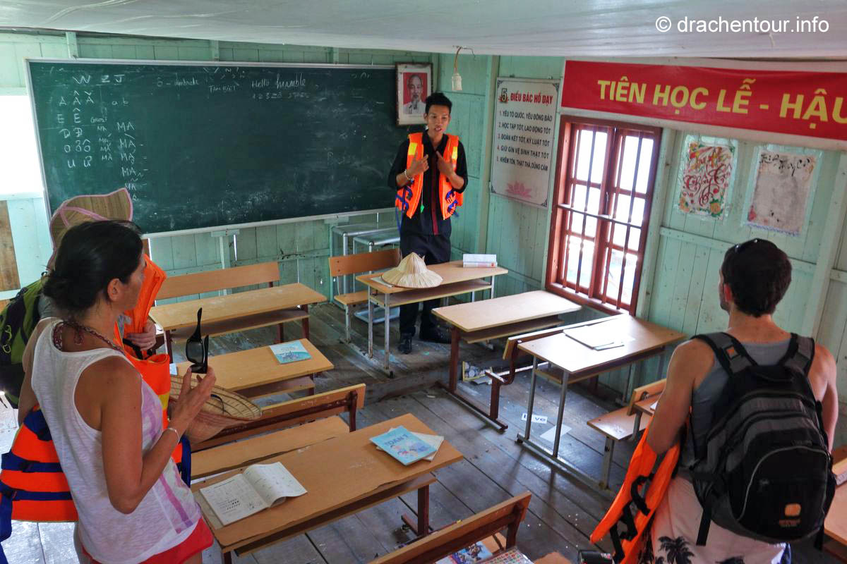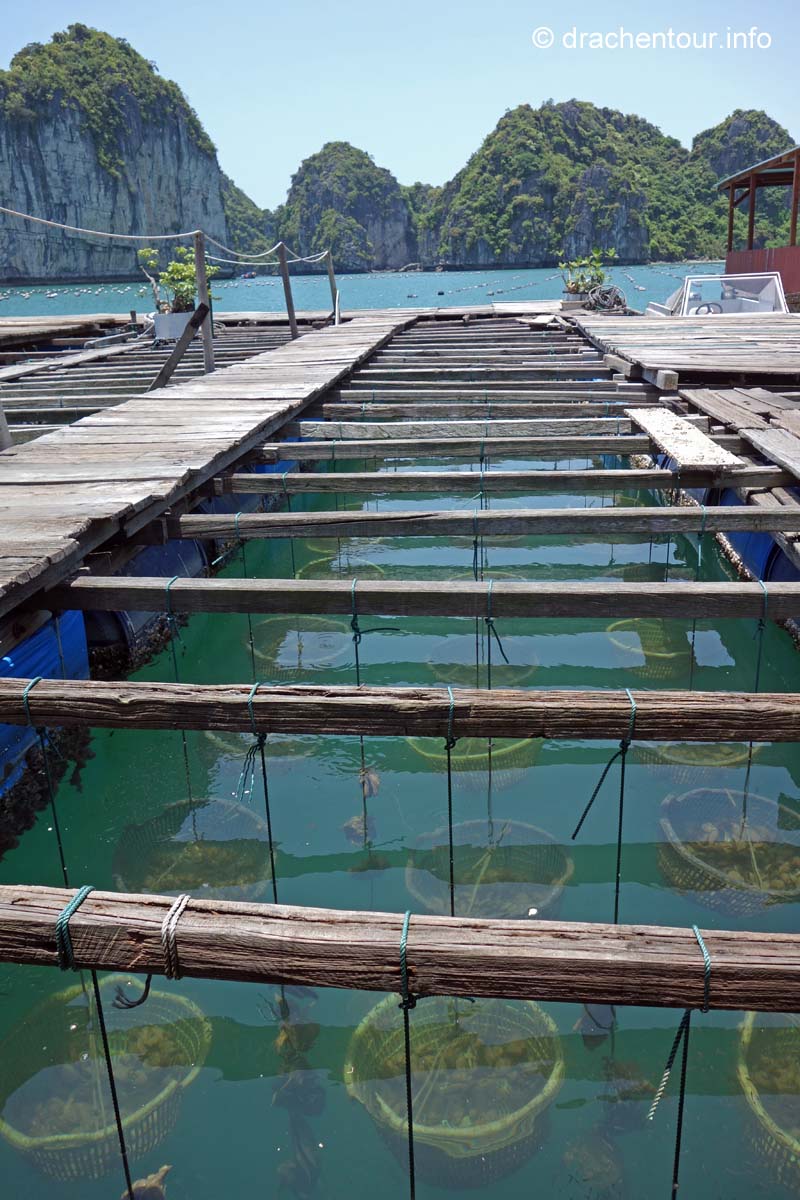 Besonders spannend war der Ausflug zum Wasserdorf Vong Vieng, denn dort bekamen wir einen Einblick, wie die Menschen auf und von dem Meer leben. D.h., wie zum Beispiel die Schule ( wie gut sind unsere Schulen im Vergleich dazu ausgestattet ) organisiert ist und wie sie Perlen aus einer Austernzucht gewinnen. Leider ist dieses empfindliche Gefüge gleich doppelt in Gefahr, zum einen, weil die Grundlage, nämlich der Fischfang immer mehr zurückgeht und zum Zweiten, weil die vietnamesische Regierung möchte, dass diese Menschen auf dem Festland sesshaft werden. Nach drei Tagen, in denen wir mit offenem Mund dieses Wunder der Natur bewundern und bestaunen durften, fuhren wir wieder mit dem Minibus zurück in die Stadt und waren richtig glücklich - was für eine tolle Zeit !